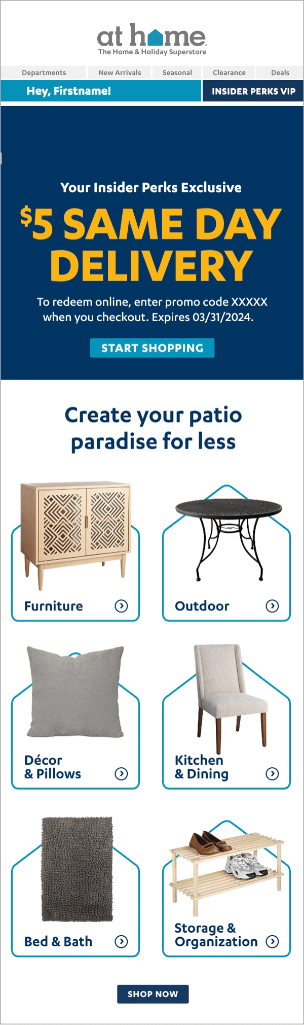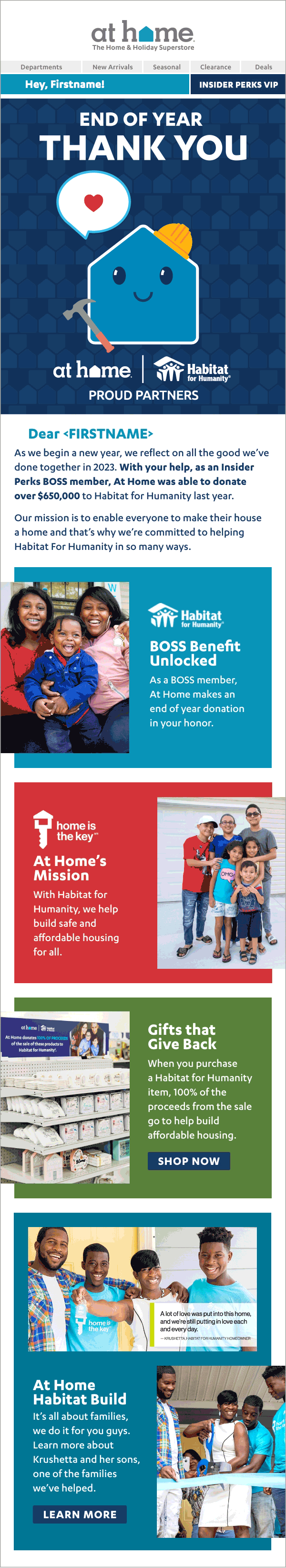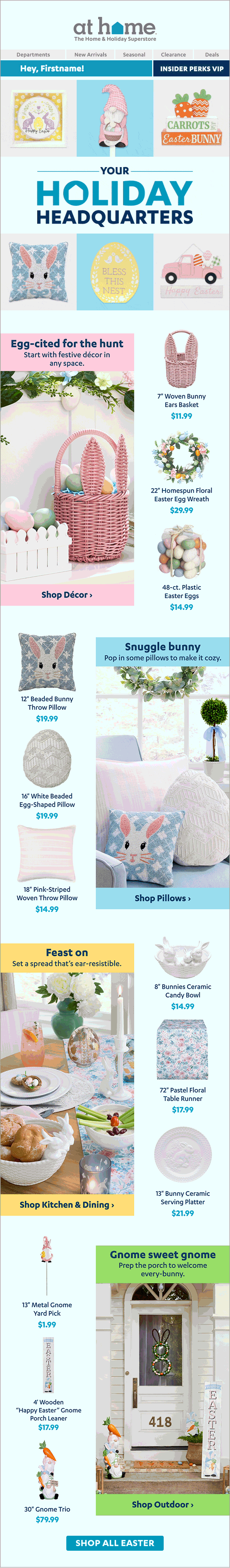 At Home – the home and holiday superstore. Everyone can find the look they love with collections from farmhouse to modern, traditional to boho. A high volume email client with emails sent almost daily.