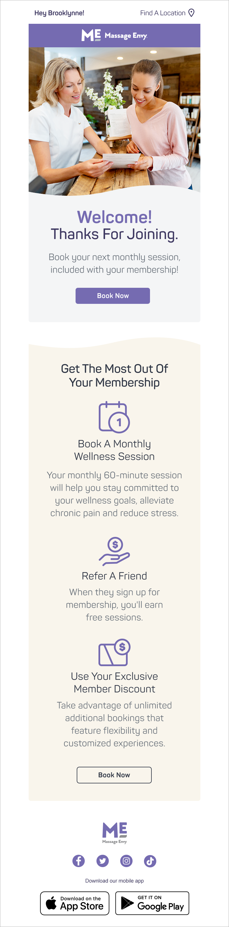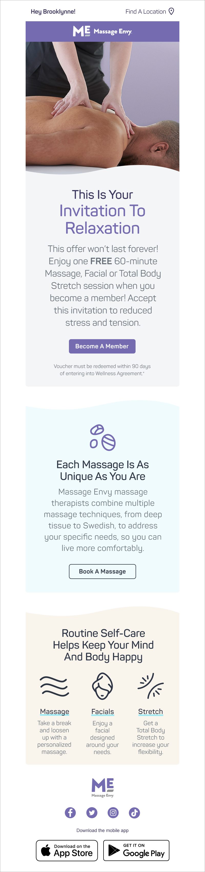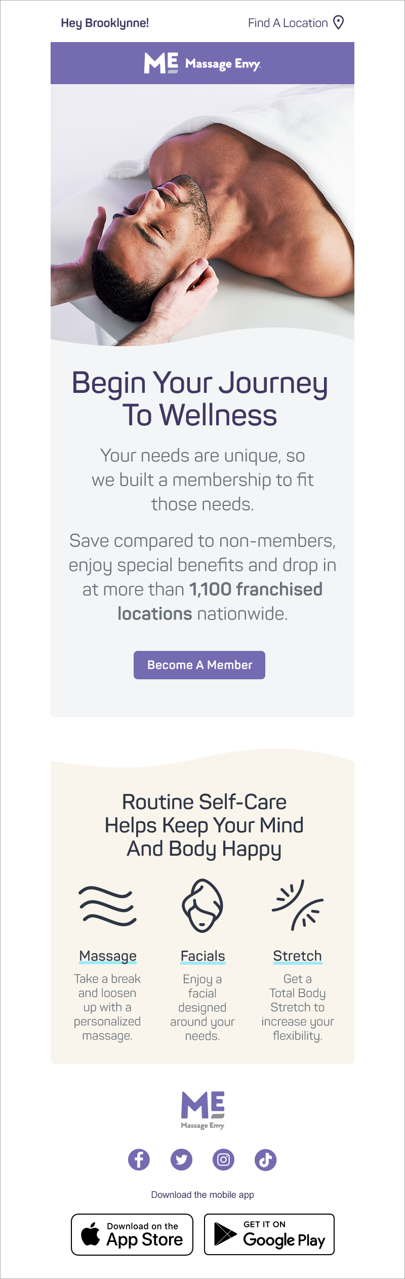 Massage Envy desired new email designs to match their updated branding. We used organic shapes and soft colors to give the feelings of movement and calmness. The Massage Envy marketing team and executives loved the designs!