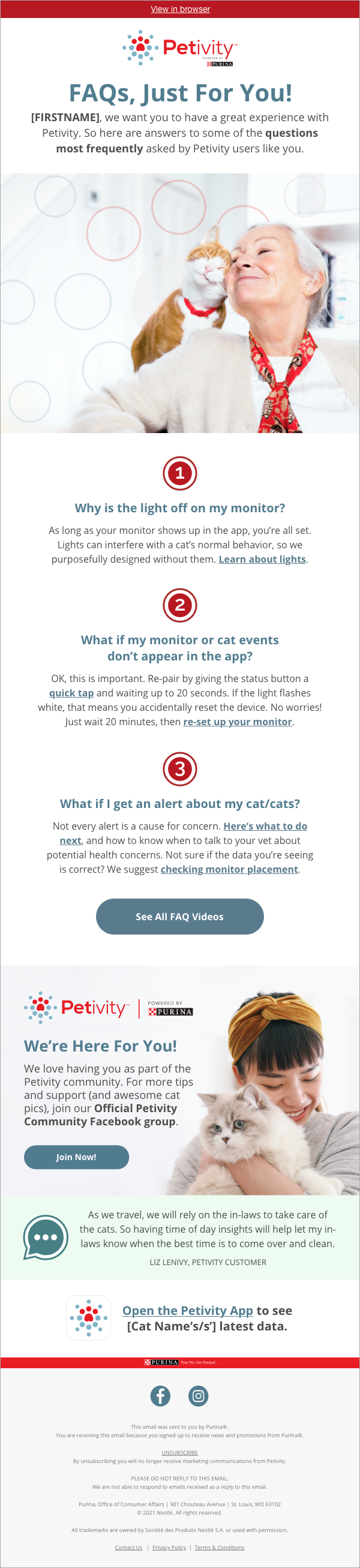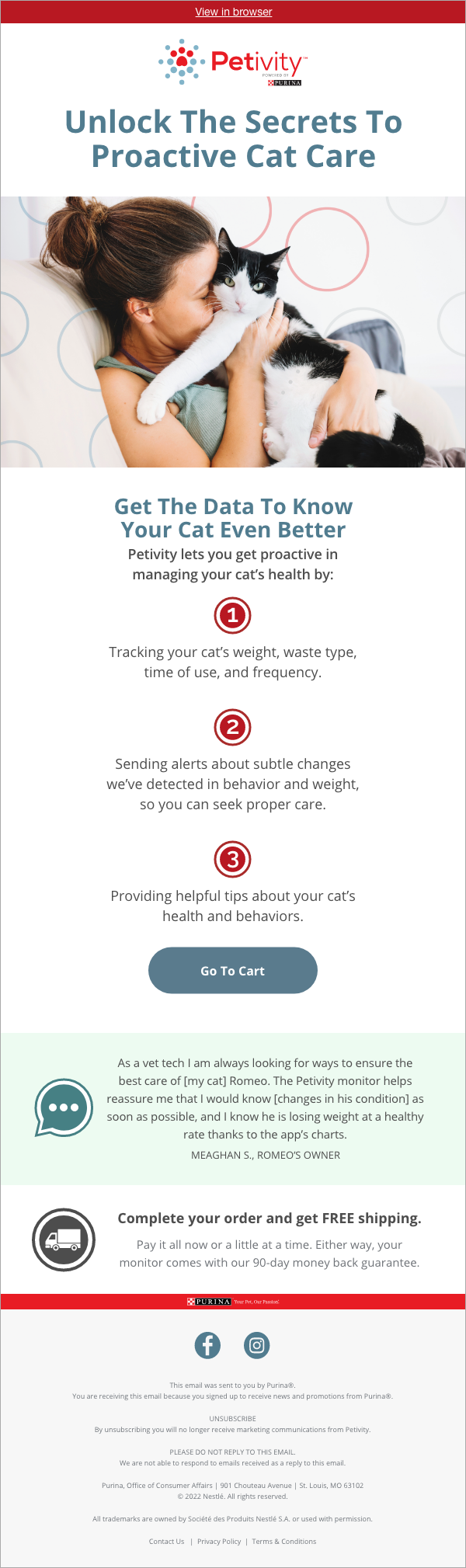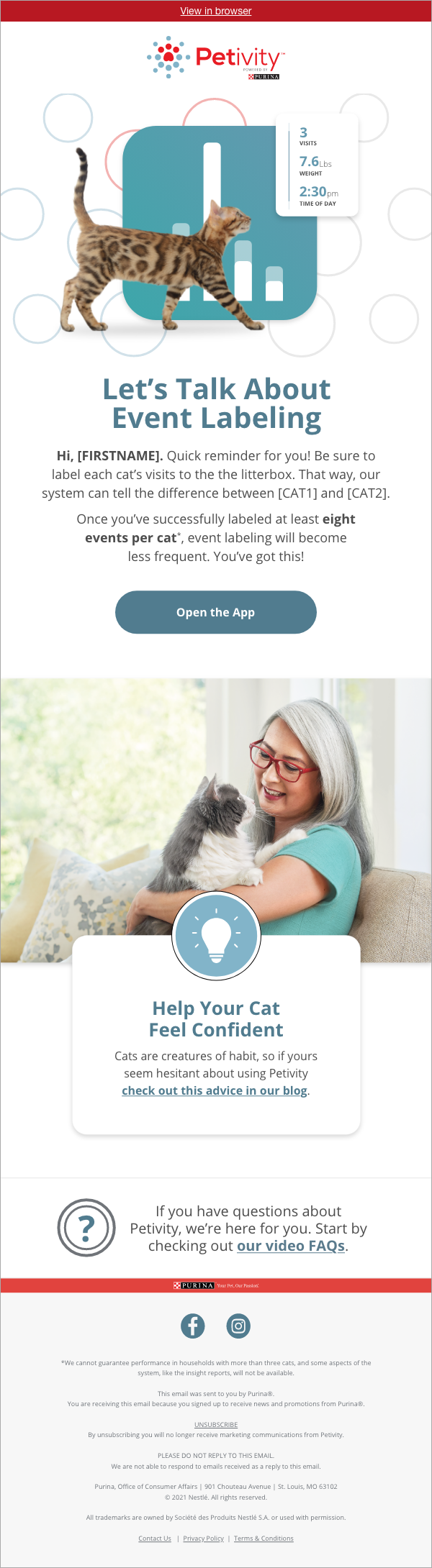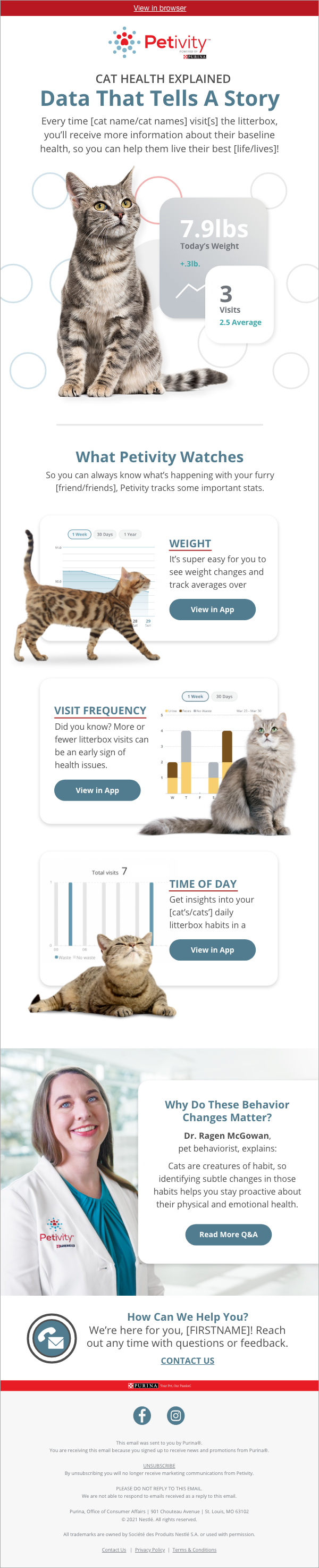 Purina requested we design the onboarding emails for the launch of their new product — the Petivity Litter Box Monitor. From the success of this initial journey Purina awarded us the entire consumer email program.